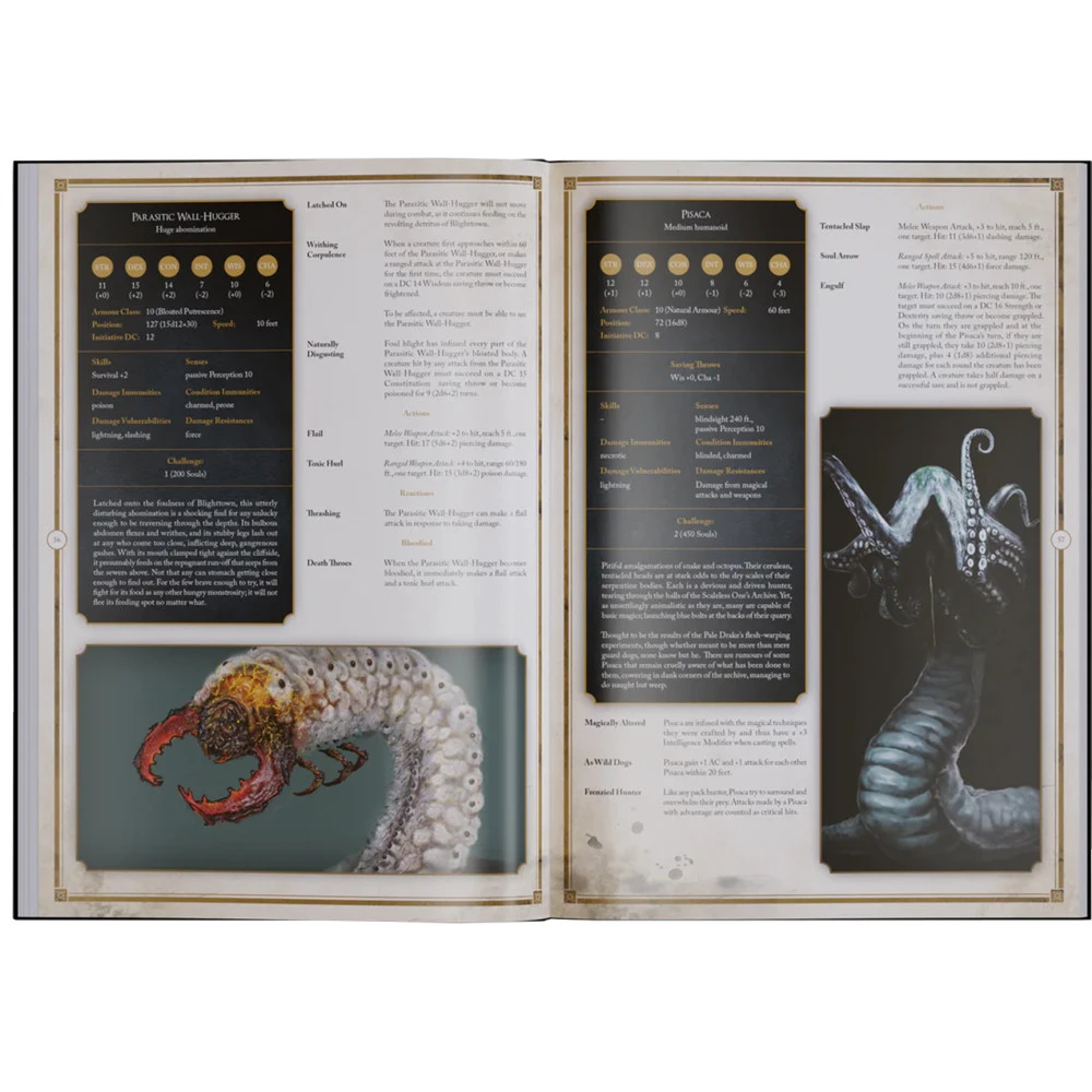 Discover profiles for over 80 unique monsters and bosses from various ages within these 120pages, providing a stern test for your roleplaying adventures. The antiquarians amongst you will find great interest in the many entries from the ancient realm of Lordran, alongside a number from Drangleic too.