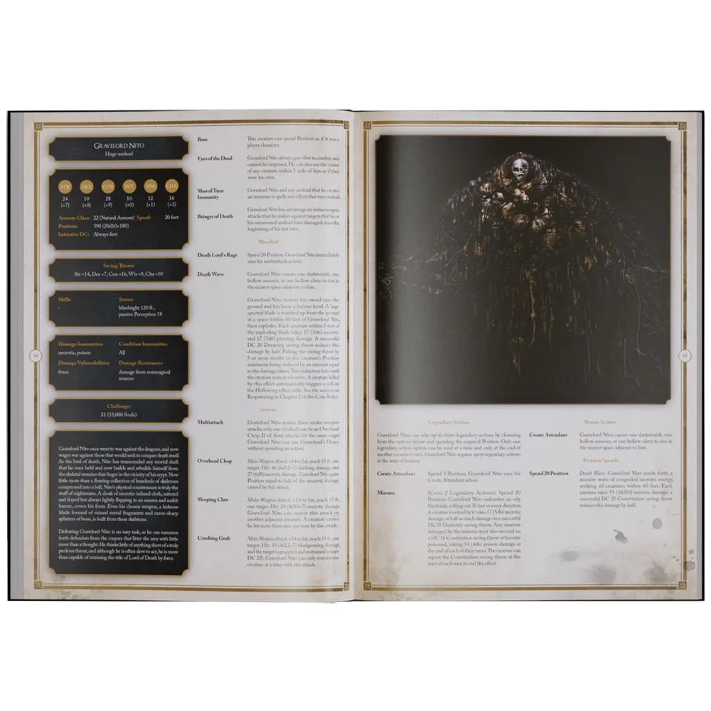 Expand your adventures with new challenges, including Ornstein and Smough, Nito, and even Lord Gwyn himself. Immerse yourself in different chapters of Dark Souls history with monsters from various worlds. Each monster entry contains 5E-compatible stats and lore that can be dropped into any RPG adventure.