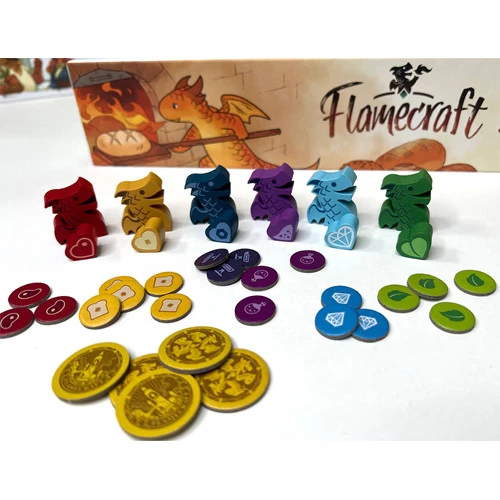 In Flamecraft, 1-5 players take on the role of Flamekeepers, gathering items, placing dragons and casting enchantments to enhance the shops of the town. Dragons are specialized (bread, meat, iron, crystal, plant and potion) and the Flamekeepers know which shops are the best home for each.