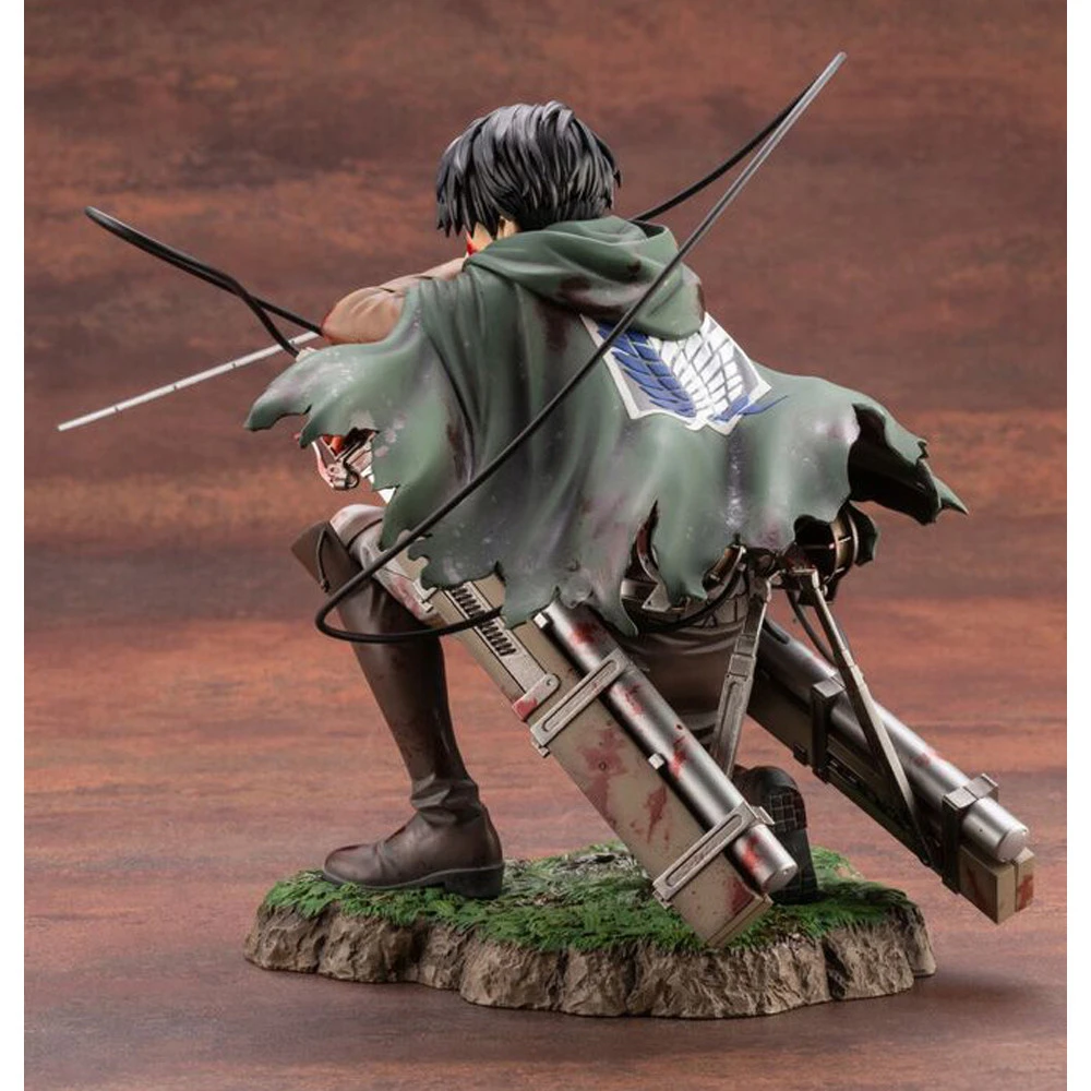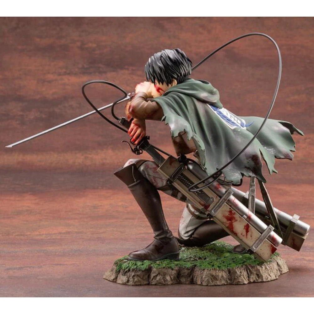 Although wounded in combat, Levi can be seen pointing the blade of his Three Dimensional Maneuver Gear at his enemy in this scale figure rendition. Despite Levi’s body being covered in wounds and uniform tattered throughout, his will to survive and fight to the end shows his strong fortitude.