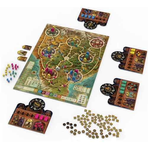 During the game, players take the role of priests who travel to different cities in India, building statues and shrines dedicated to their favorite Gods to expand their worship. To do so, they are assisted by several characters with different abilities. Every year, the Maharaja, the great king of India, will change his residence and players will receive rewards according to their Gods’ worship value. At the beginning of each year, players plan their actions in a secret phase to be played simultaneously. At the end of the seventh year or when a player builds their seventh statue, the game ends, then the player with most prestige wins.