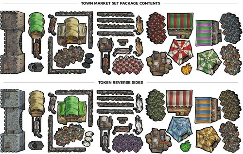 This set features market stalls, tents, crowds, livestock and gate tower – everything you need to outfit your battlemap with a town market square.