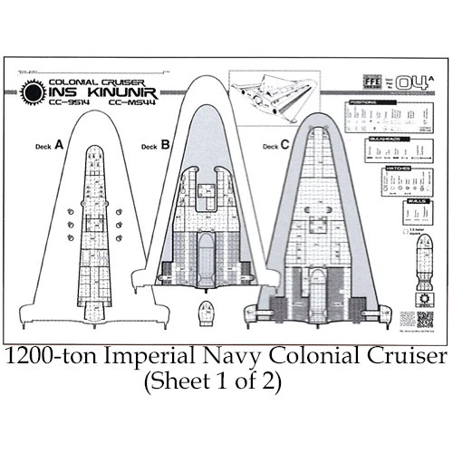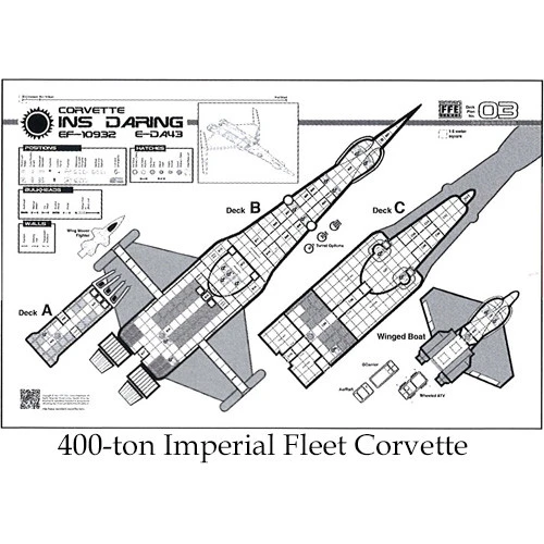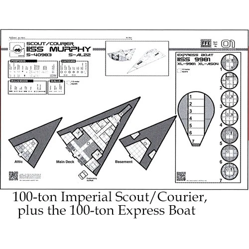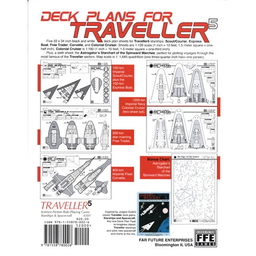 This set includes five 22″x34″ black-and-white deck plan sheets for Traveller5 starships: Scout/Courier, Express Boat, Free Trader, Corvette, and Colonial Cruiser.
