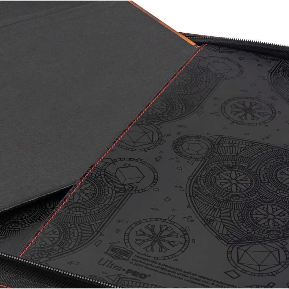 Prepare for adventure with the official Printed Leatherette Book Folio for Dungeons & Dragons! This is an updated version of the Premium Zippered Character Folio, redesigned to fit any D&D sourcebook, including your Player’s Handbook, and features Dungeons & Dragons: Honor Among Thieves artwork. Inside the premium canvas cover you’ll find a pocket to store notes or maps, 10 wet/dry-erase compatible pages for character sheets and notes, six 9-pocket pages for standard size spell cards, an elastic loop to store a pencil or marker, a D&D branded graph paper notepad, and the added pocket in the back to slide in the back cover of a sourcebook for easy access. All contents are secured by a zipper featuring a custom D&D ampersand pull tab.
