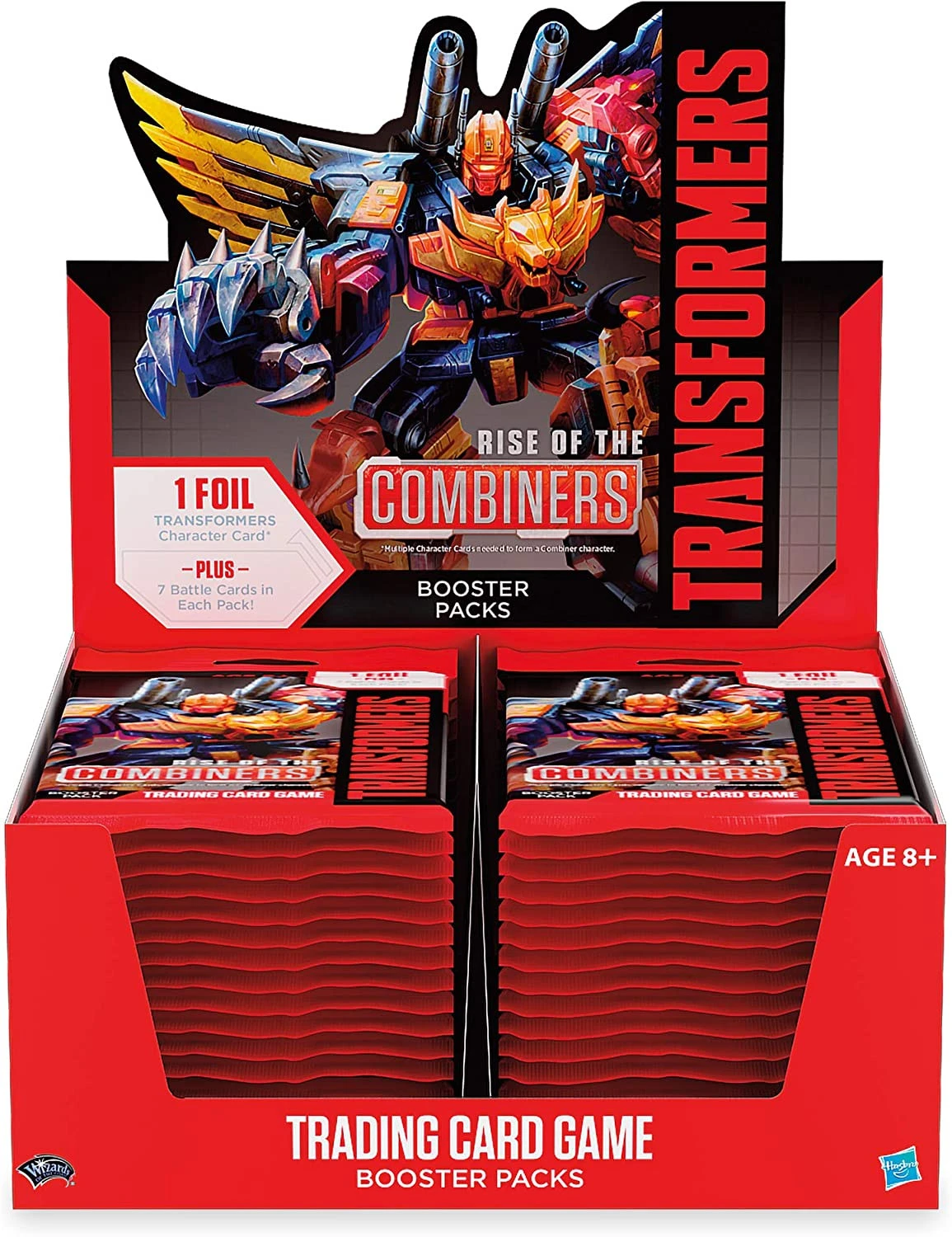 Each booster pack contains 1 foil Transformers Character Card and 7 Battle Cards. Approximately 1:2 Rise of the Combiners booster packs contains a Character Card needed to form a Combiner character. Chance of Super Rare Transformers Character Card 1:50 booster packs. Each booster pack contains 1 Rare Battle Card.
